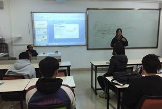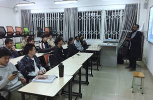 活动开始,三位留学生和本班同学都依次用英语进行了自我介绍,大家进行了简短的交流沟通。Abebe同学为我们介绍了埃塞俄比亚的语言、美食、建筑、服装、舞蹈等人文与自然风光。其中,他特别提到了他们的“父亲河”尼罗河以及东非大裂谷等自然风光。在民族文化方面,Abebe还介绍了埃塞俄比亚语言的字母,与班上同学积极互动,并用埃塞俄比亚语言书写同学们的名字。