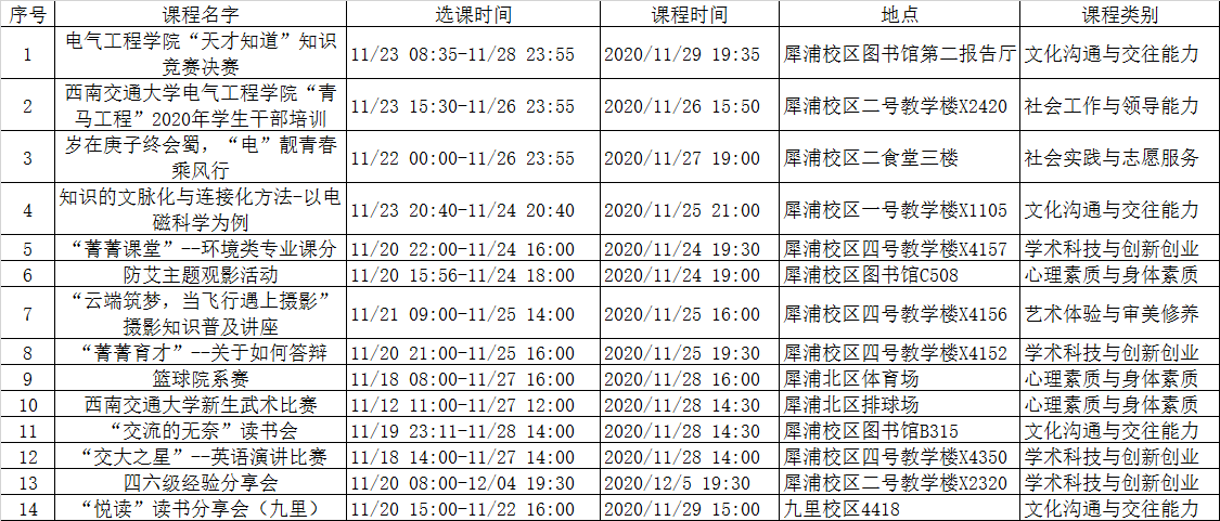 2020-2021学年第一学期11周第二课堂开课目录