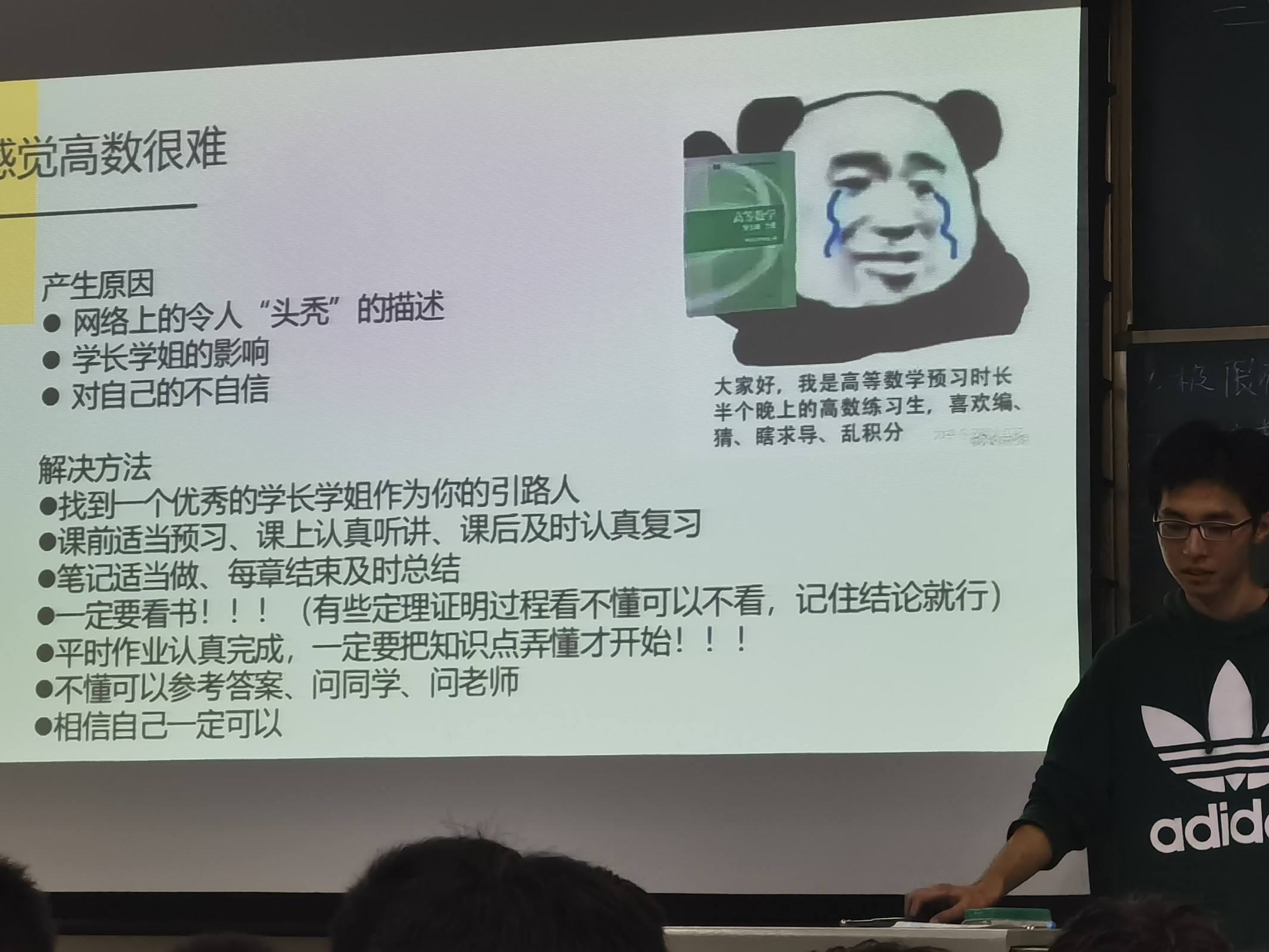 第四期的主讲人为2019级兰宇田同学,他详细地为大家讲解了线性代数的学习方法与应试技巧,建议大家要重视学习笔记整理和习题积累,学会举一反三,把平时遇到的好题与错题做上标记,方便期末复习,提高学习效率。对于大学学习和生活,兰宇田还谈到了时间管理的重要性,他从个人学业、班委工作、兴趣爱好等方面与同学们展开讨论,为大一的同学们应该如何规划大学生活提供了一个明确的思路。
