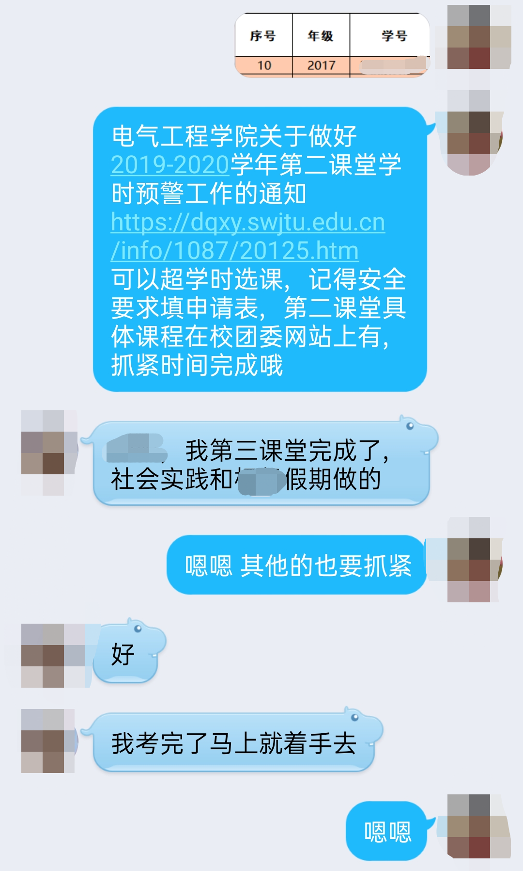 通过院网公告、QQ群公告、年级大会、学生骨干培训会等途径强调第二课堂学时重要性,并指定各班班长、团支书重点帮扶第二课堂学时预警学生,要求确保本科2017级学生在本学期内达到第二课堂学时的毕业要求,要求确保本科2018级、2019级在本学期内消除学时预警。