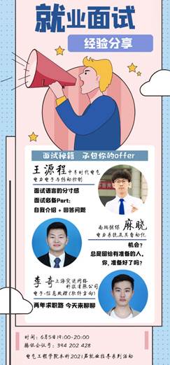 2020年6月5日晚19:00,av大平台 本科2021届就业指导系列活动之就业面试经验线上交流会。本次会议邀请到了电力电子与控制专业的王源程、电力系统及其自动化专业的麻晓和电子信息工程专业的李奇。他们各自从事不同领域的工作,并且都到此来分享自己在求职过程中的心得体会和宝贵经验。