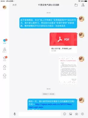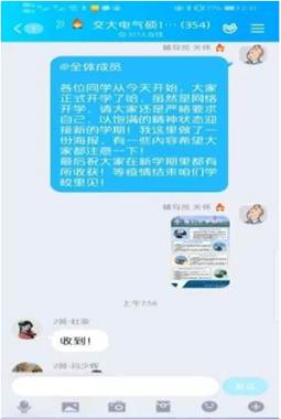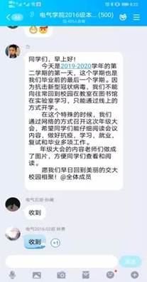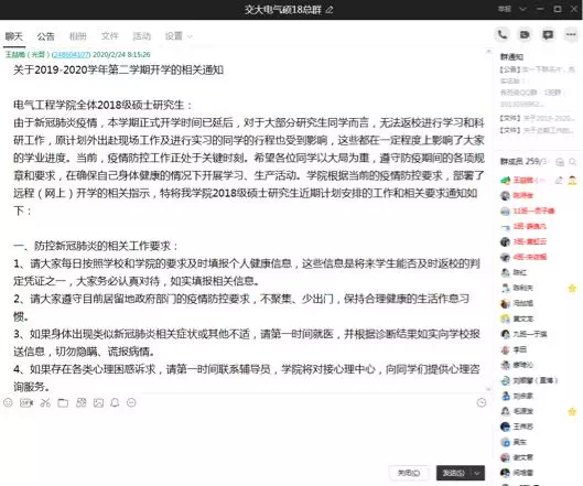 硕士生2018级辅导员王喆桅利用QQ平台,进行线上开学典礼及班长会议,并分别在年级群及各班级群内发布了《关于2019-2020学年第二学期开学的相关通知(硕2018级专用)》,从防控疾病、就业规划等方面提醒并督促研二同学尽早进入学习状态,完善自身学习就业规划并充分做好准备工作,已覆盖全年级329名学生。
