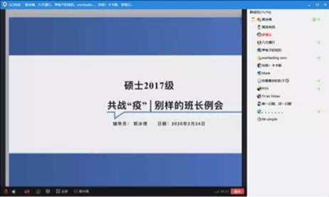 随后召开了新学期第一次线上班长例会,辅导员们再次强调了网络教学期间学生管理的相应要求,由于疫情原因学校推迟开学,希望同学们保持身体健康,在家进行自我提升,完善自身的升学就业等重大人生规划,为疫情结束后的就业、毕业事宜做好充足准备,争取跑好本科的最后一程。最后,辅导员老师们还对即将毕业的本科2016级同学们献上了衷心的祝福和寄语!