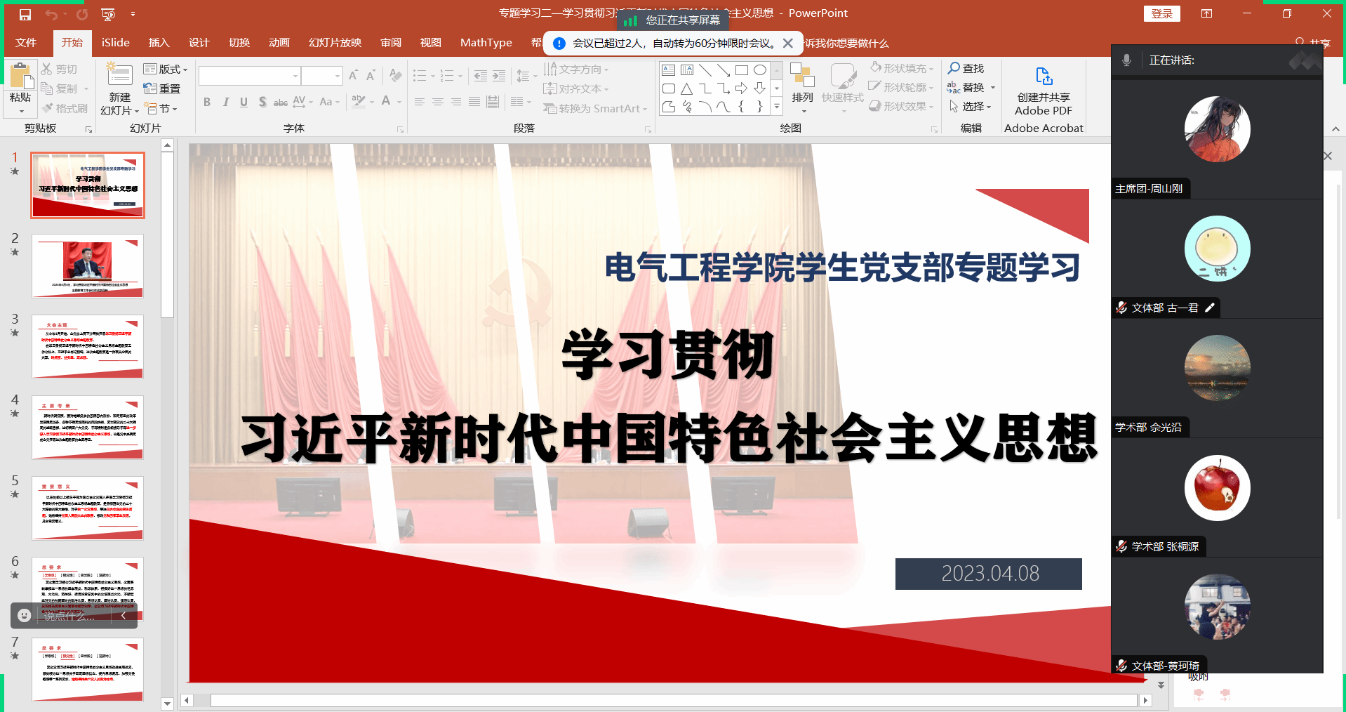 2023年4月8日,av大平台 研究生临时党支部开展“学习贯彻习近平新时代中国特色社会主义思想”专题学习会议。研究生会全体成员参与此次活动,活动由周山刚同志领学。