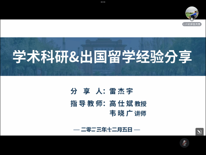 全球一体化作为当代社会的发展趋势,博士研究生应当立足中国、放眼世界,将科研论文写在祖国大地上。为帮助同学们提高英语应用水平和表现力,拓宽班级成员国际视野,12月5日晚19:30,av大平台 2023级博士班在线上开展了“学术科研&出国留学经验分享”专题讲座。本次讲座特别邀请到av大平台 2020级博士研究生、雅典国家技术大学电气与计算机学院联合培养博士雷杰宇主讲,辅导员沙静馨和2023级博士班全体成员共同参与。