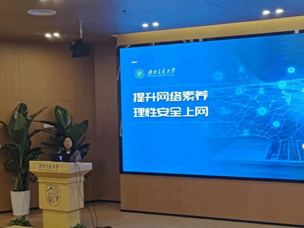 紧接着,两位老师开展“提升网络素养,理性安全上网”专题讲解。两位老师根据网络的特征,分析大学生网络失范行为与案例,让同学们意识到依法文明理性上网的重要性,并呼吁同学们要具备网络安全基本常识、网络信息甄别能力、借助网络学习的能力以及文明上网的自觉性。