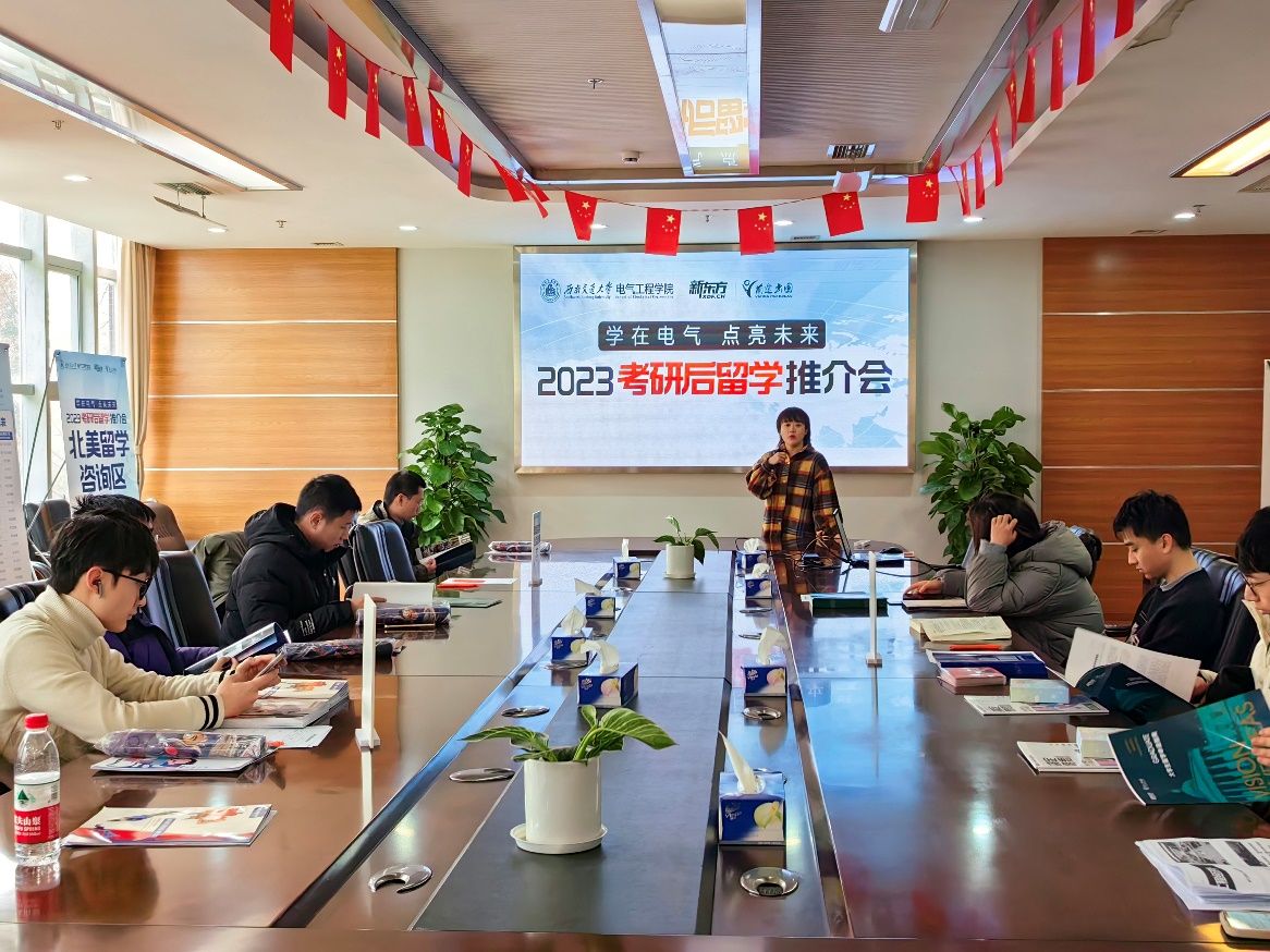 在电气馆10212举办2023考研后留学推介会,讲座由新东方前途出国专业咨询师谢玉馨老师主讲,新东方前途出国各地区咨询师、学院辅导员郭冰倩及部分大三、大四学生共同参与。