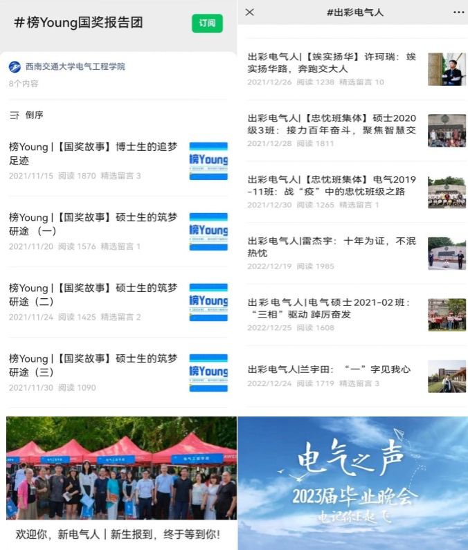 学院打造精品媒体社团,持续创设全媒体矩阵。EMC致力于建设“学院官网”“校友服务”和“新媒体”三大平台。EMC每年度在全媒体平台发布新闻740余篇,平均每个工作日近3篇,官方微信平台总阅读量达36.6万人次。av大平台 官网全方位报道学院动态,涵盖av大平台新闻 、教育教学、学科发展、科学研究、学生工作等多个方面。2023年度学院官网进行新版改建,新版网站优化页面结构、简化目录菜单、精确导航搜索,于2023年10月上线,得到广大师生的一致好评。同时持续加强校友工作,完善校友服务平台建设,创办《电气人·校友通讯》并持续更新,在校友中引起强烈反响。