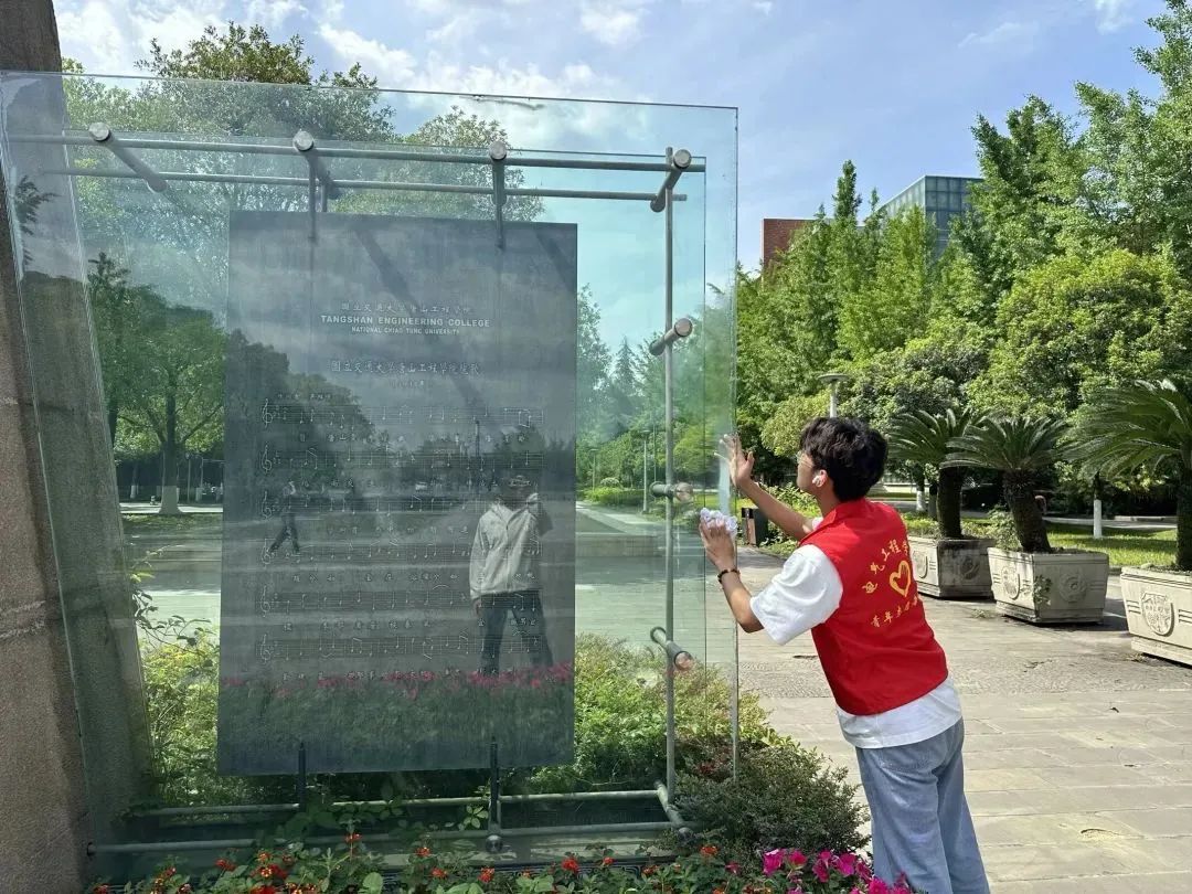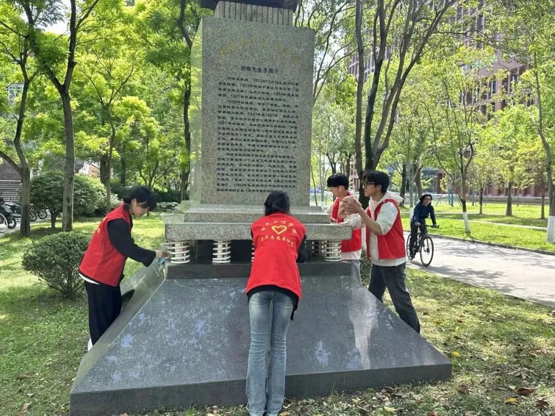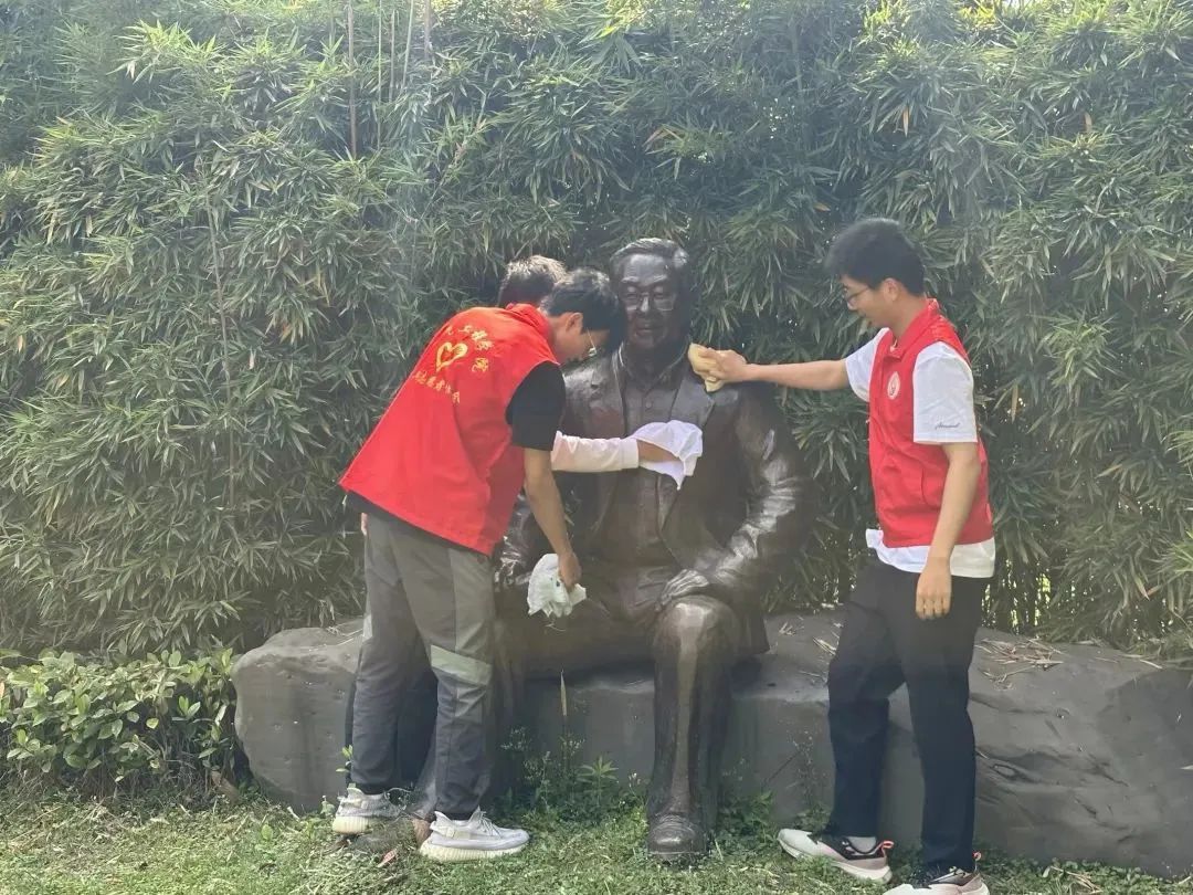 下午15:00,志愿者们在犀浦校区一、二号教学楼等教学区域对雕塑进行细致的清洁,去除表面的污垢和灰尘。在打扫的同时,志愿者们重温学校的悠久历史,学习杰出校友的先进事迹。