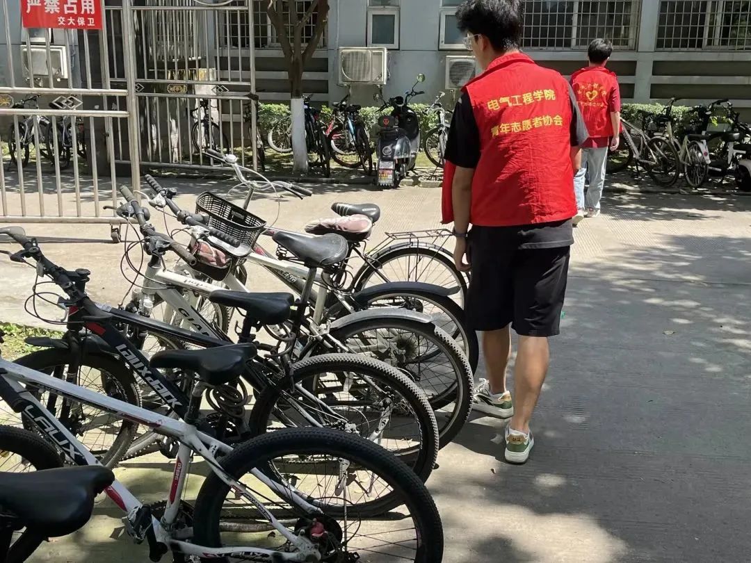 在犀浦校区食堂、商业街、图书馆门口,志愿者们将乱停乱放的单车进行整理,按照规定的区域进行摆放,确保单车摆放整齐有序。本次活动使“文明骑行、规范停放”的理念深入每一位电气学子内心,还为同学们绿色出行提供便捷的服务,同时使学校容貌更加整洁有序。