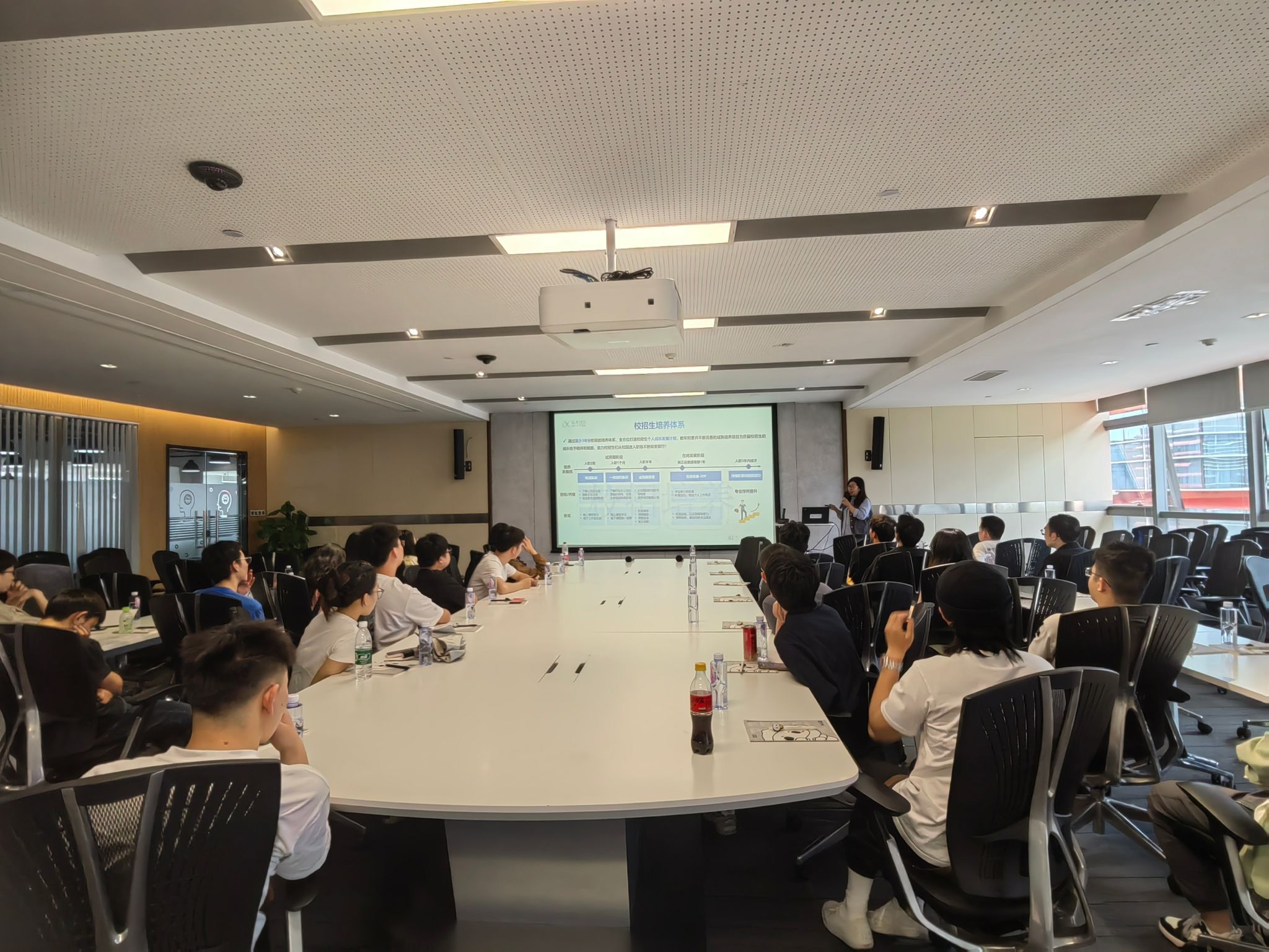 结束展厅参观后,工作人员带领大家前往四楼会议室开展座谈会。主持人向大家介绍了讯飞技术的发展及行业应用、校招及人才培养信息,让大家对科大讯飞的招聘有了更全面的了解。