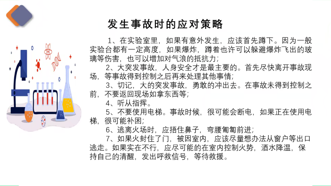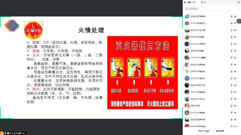紧接着,刘仕兵老师着重讲述了实验室安全细则,包括水、电、气等基础设施和化学药品的使用及处理和事故应急处理等方面进行讲述。特别强调了在遇到火灾时一定要首先拨打119报警说明火源、火情和地理位置等重要信息,并将灭火器的使用分为了四个步骤(一提、二拔、三握、四扫)。强调了在遇到火灾时一定要做到沉着冷静,对不同的燃物选择不同的类型的灭火器进行救火。火灾不能预期、不能杜绝、只能预防消除火灾隐患。