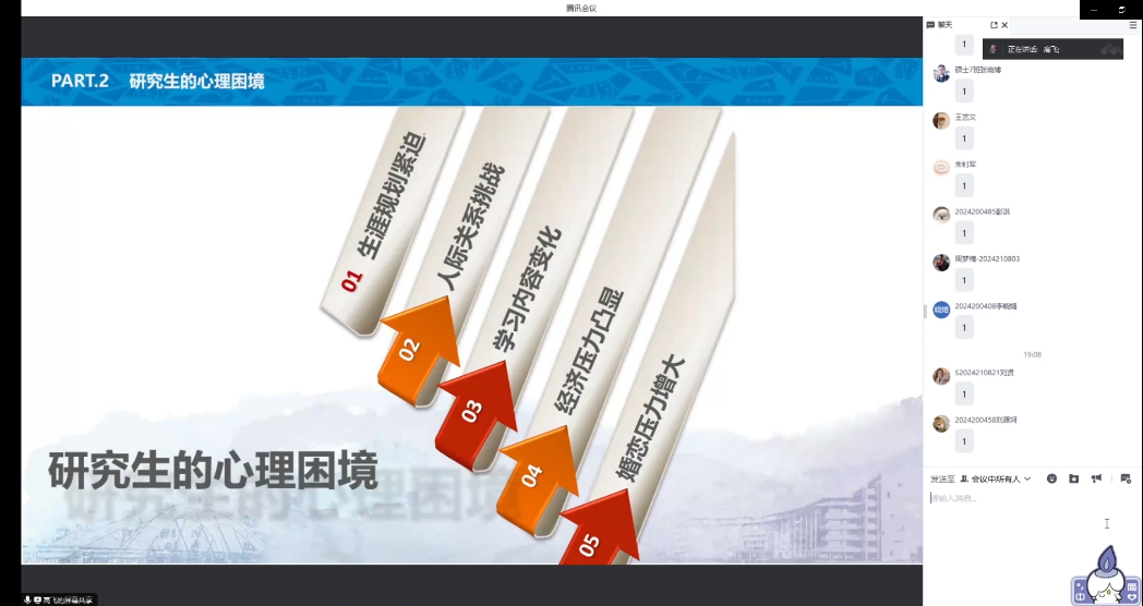 随后,高飞老师分析了同学们的心理困境。进入研究生阶段,同学们要面临未来的生涯规划、和导师同门的人际关系、和本科阶段不同的学习内容、经济方面的压力以及个人情感和婚恋方面的压力等等多方面的挑战。高飞老师针对以上的问题,分别为同学们讲解了问题的缘由,并且提出了对应的解决方案。高飞老师鼓励同学们在遇到遇到种种问题时能够保持良好的心态。