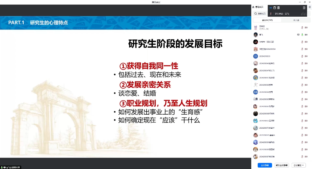 首先,高飞老师为同学们介绍了埃里克森人生发展8阶段理论。研究生同学们正处于成年早期到成年期的过渡阶段,面对着亲密对孤独、生育对自我专注的冲突。讲解了同学们进入研究生阶段后的心理特点,分析了研究生阶段同学们大致的发展目标。