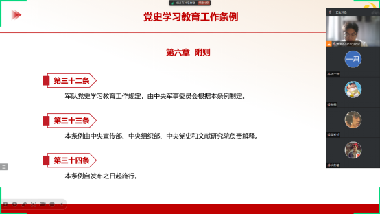 为深入贯彻落实《党史学习教育工作条例》(以下简称《条例》),推动党史学习教育常态化、长效化,2024年3月6日,av大平台 研究生会组织开展了《党史学习教育工作条例》专题学习活动。本次活动由研会学术部副部长张桐源主讲,研究生会全体成员参加。