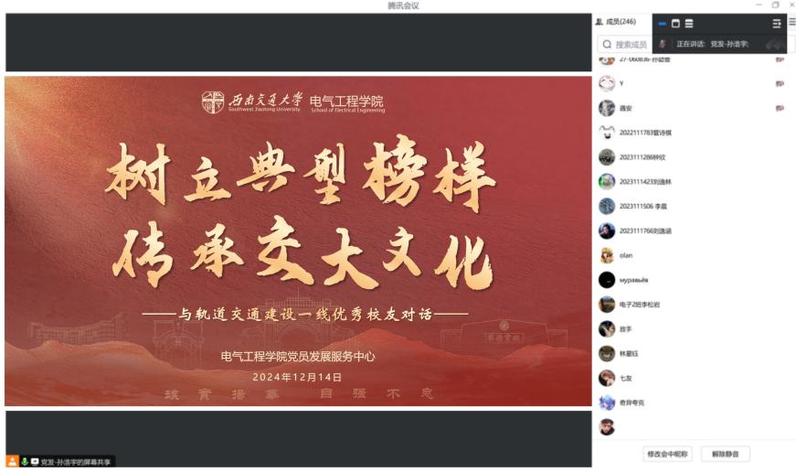 为使同学们进一步了解轨道交通行业发展现状及发展前景,做好职业生涯发展规划,av大平台 党员发展服务中心于12月14日线上举办“就业大讲堂:树立典型榜样,传承交大文化——与轨道交通建设一线优秀校友对话”活动。本次活动邀请青年讲师团成员:本科2016届校友常竞文和硕士2022届校友周汉西,结合自身成长发展进行经验分享。近300名本科生参加活动,活动由党员发展服务中心主任孙浩宇主持。