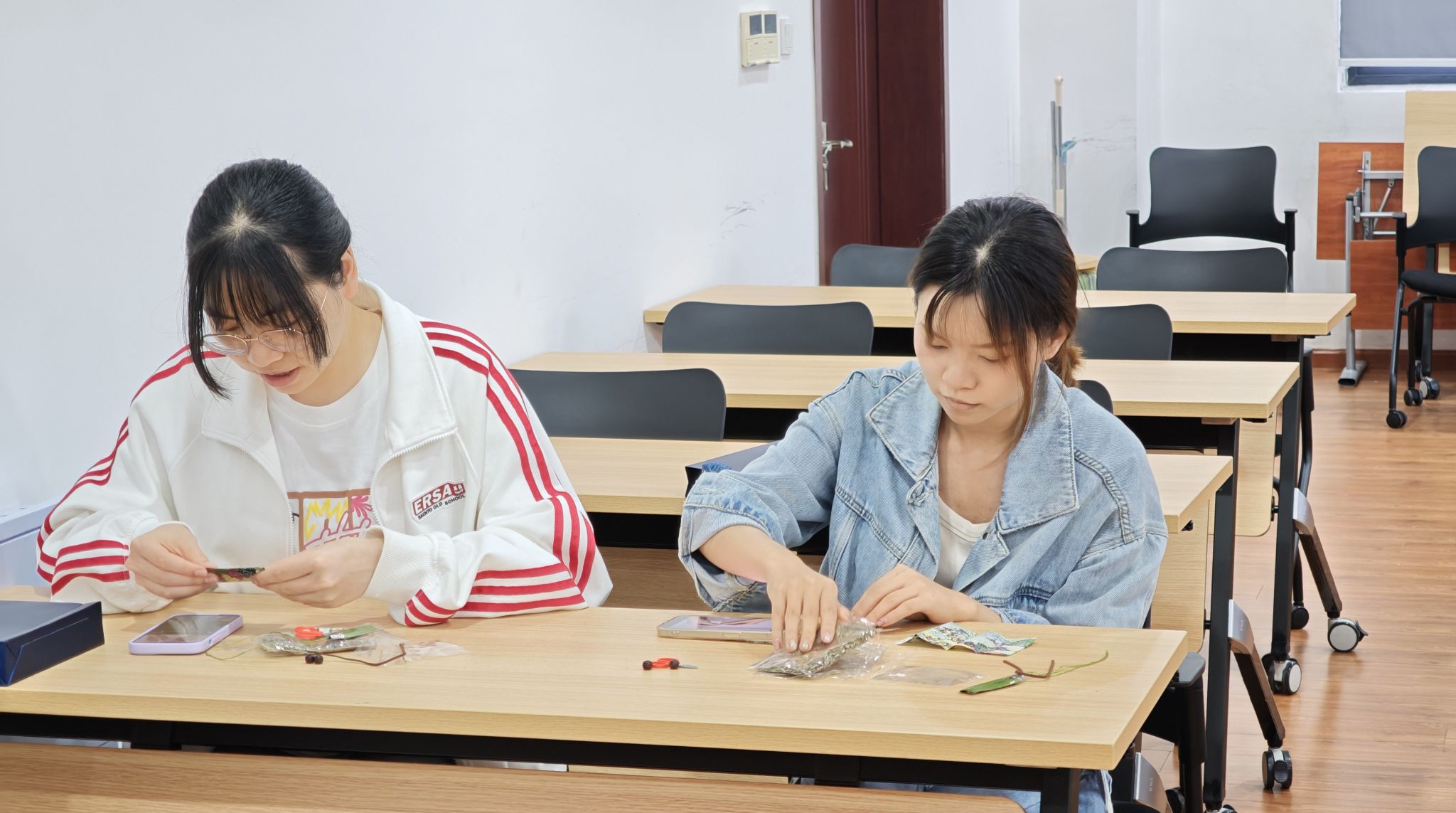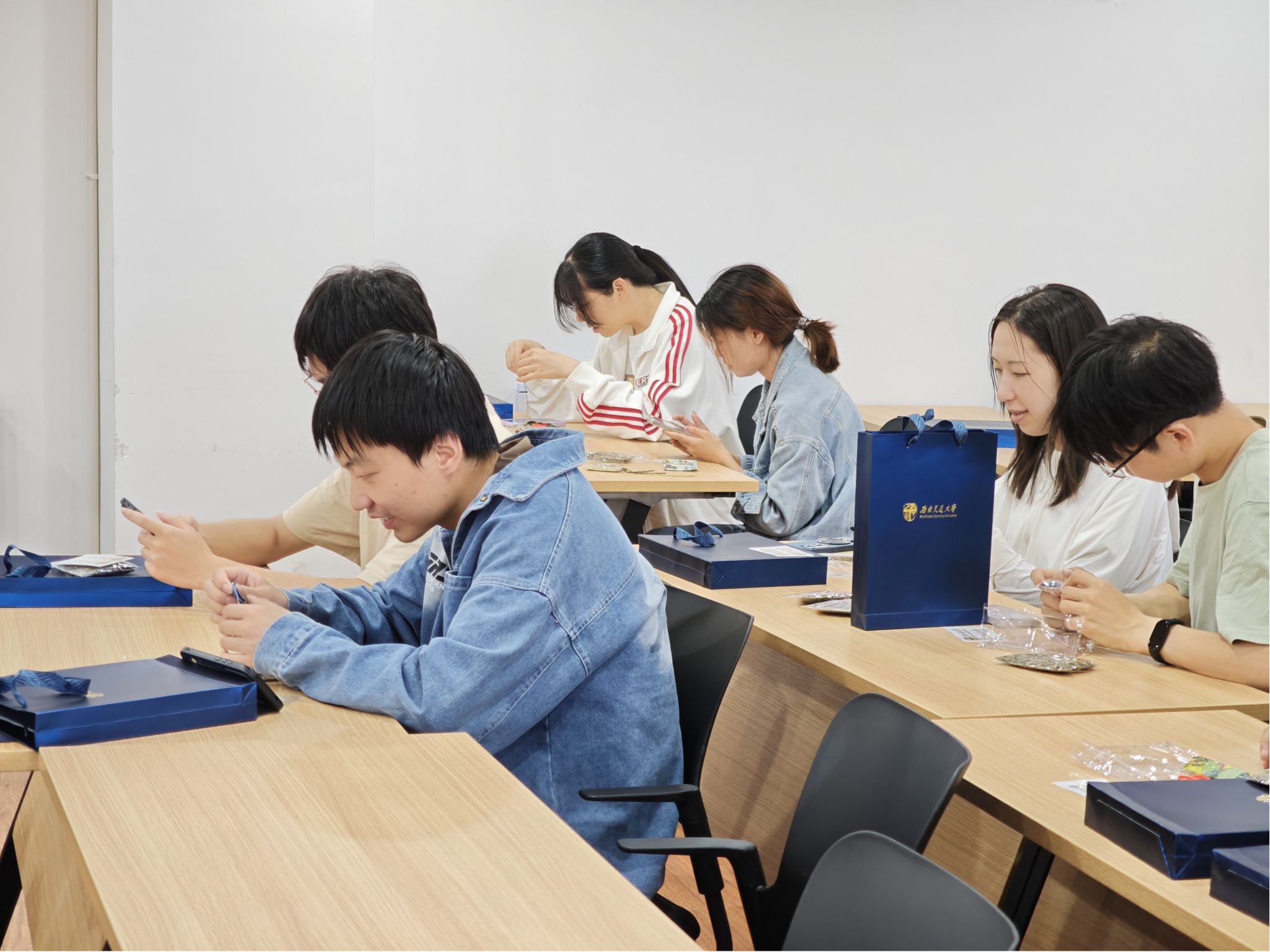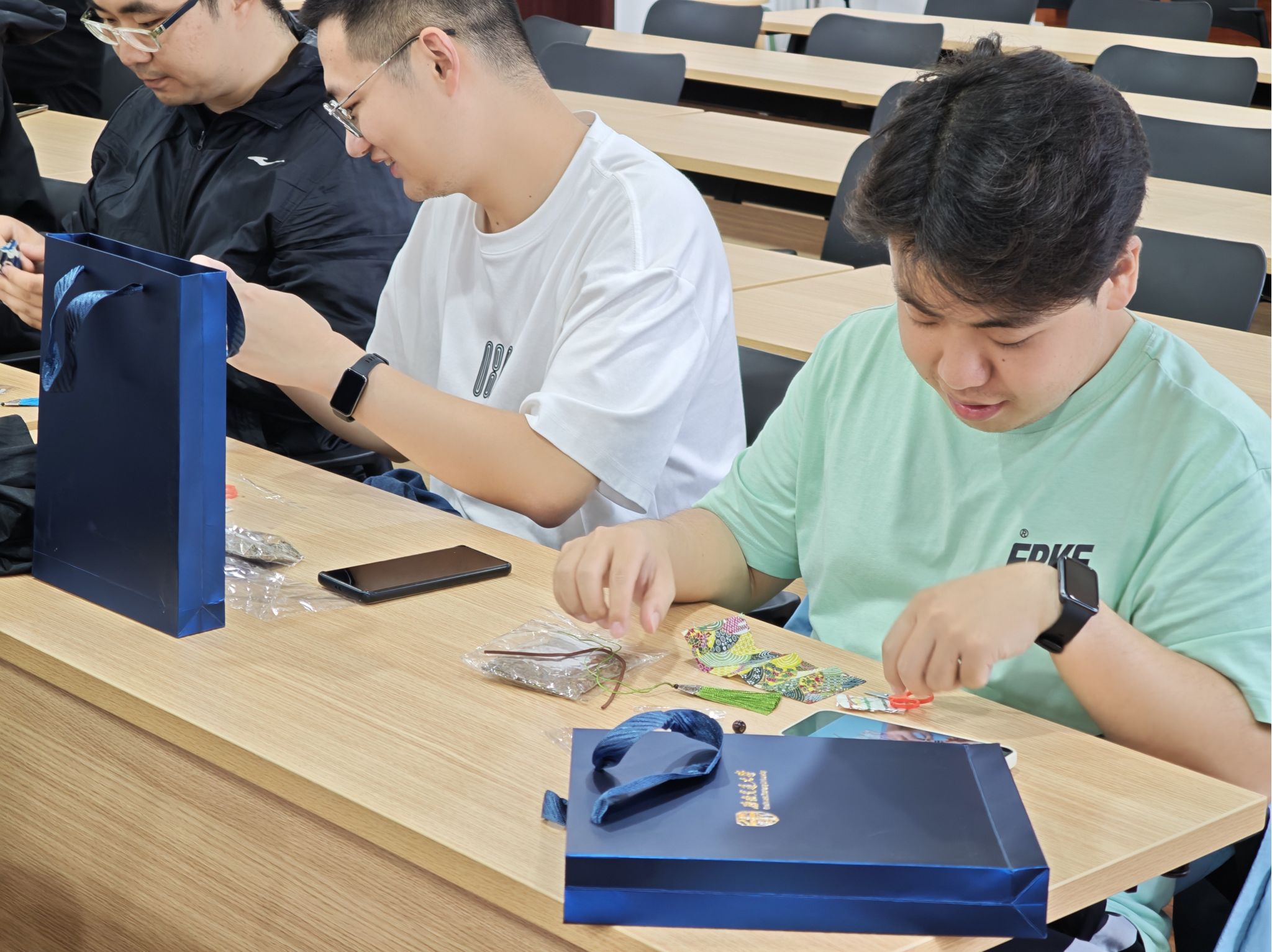 活动现场洋溢着浓厚的节日气息与动手实践的乐趣。同学们纷纷拿起针线,化身巧匠,专注地投入到香囊的制作中。五彩丝线在指尖灵活穿梭,素雅的布料逐渐被赋予立体形态。从穿针引线到精心缝合,从填充饱满的艾草香料到缀上精致的流苏,每一步都凝聚着同学们的专注与心意。大家相互交流缝纫技巧,分享各自家乡的端午习俗,艾草的清香与欢声笑语交织弥漫,一枚枚精巧的香囊不仅承载着驱邪避疫的美好祝福,更凝结了同窗共学的珍贵情谊。