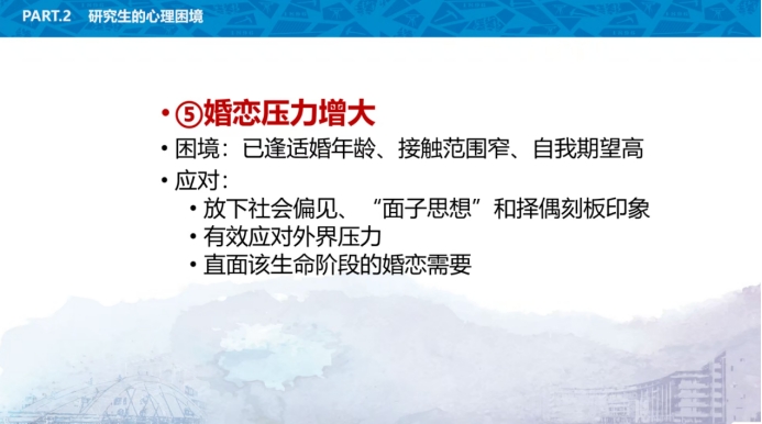 其次,高飞老师从如何进行生涯规划、人际关系挑战、学习内容的变化、经济压力和婚恋压力五个方面来分析研究生的心理困境,并且提出了有效的应对措施。