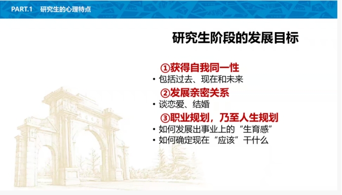 首先,高飞老师介绍了埃里克森人生发展8阶段理论,研究生群体多处于成年早期,面临亲密与孤独、生育与自我专注的冲突。深刻剖析了研究生心理特点,明确了研究生阶段自我同一性、发展亲密关系及规划职业生涯等重要发展目标。