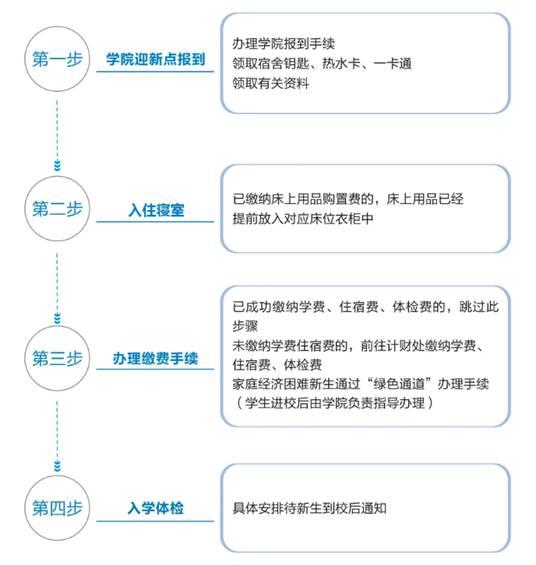 进入学校后,同学们需于学院迎新点报到,领取自己的宿舍钥匙、热水卡、一卡通及有关资料(非常重要,务必妥善保管)。床上用品已经提前放入缴纳床上用品购置费同学的衣柜中,未缴费的新生还需前往计财处办理缴费手续,家庭经济困难新生通过“绿色通道”办理手续。