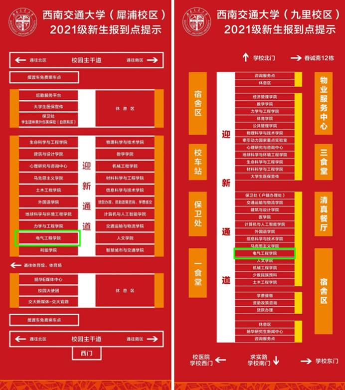 犀浦校区:报到点位于南区学生宿舍与体育馆之间的银杏大道。新生从西门进入学校报到,其余校门不对入学报到新生开放。报到结束可乘坐免费摆渡车辆至南北区宿舍。