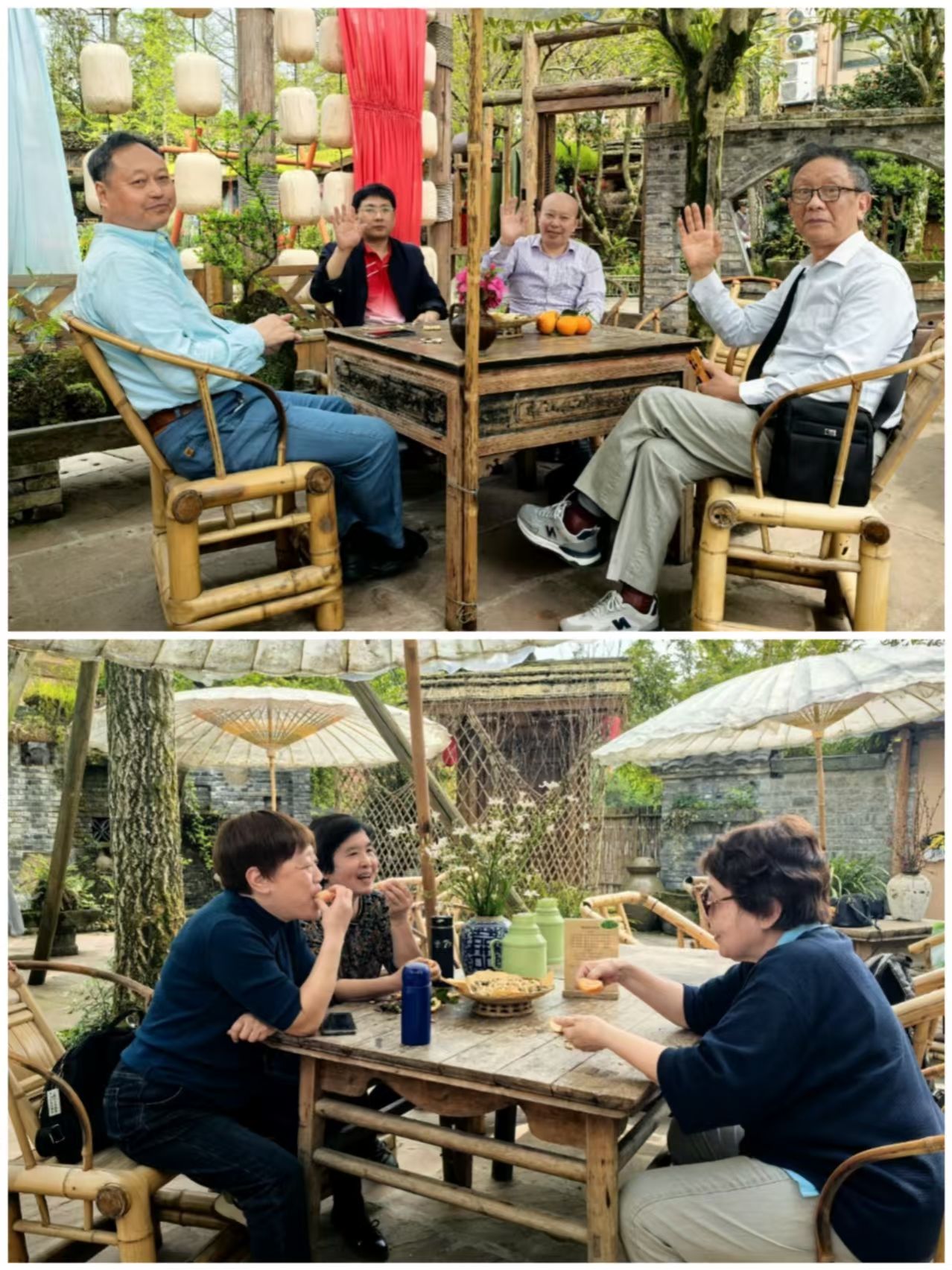 上午10时,老师们乘车抵达都江堰问花村。时值春暖花开,园区内海棠、木绣球等竞相绽放,老师们漫步于花海小径,拍照留念,感受大自然的生机与诗意。中午,大家在特色农家乐共进午餐。餐桌上,老师们回忆往昔执教岁月,分享退休后的生活趣事,有人谈起孙辈的成长,有人交流养生心得,现场笑声不断。饭后,大家围坐在圆桌旁,开启交流时光。清茶氤氲,春风拂面,话题从健康养生延展到生活琐碎,大家彼此畅叙往事,情谊在春日暖阳中愈发醇厚。