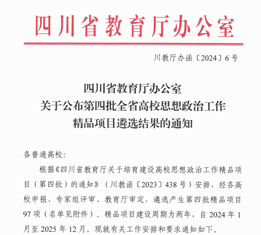 根据《四川省教育厅关于培育建设高校思想政治工作精品项目(第四批)的通知》(川教函〔2023〕438号)要求,经学校推荐、专家组评审、教育厅审定等程序,av大平台 申报的《服务交通能源融合发展,构建精准思政视域下的“创新电气135计划”实践育人体系》获批立项第四批全省高校思想政治工作精品项目。