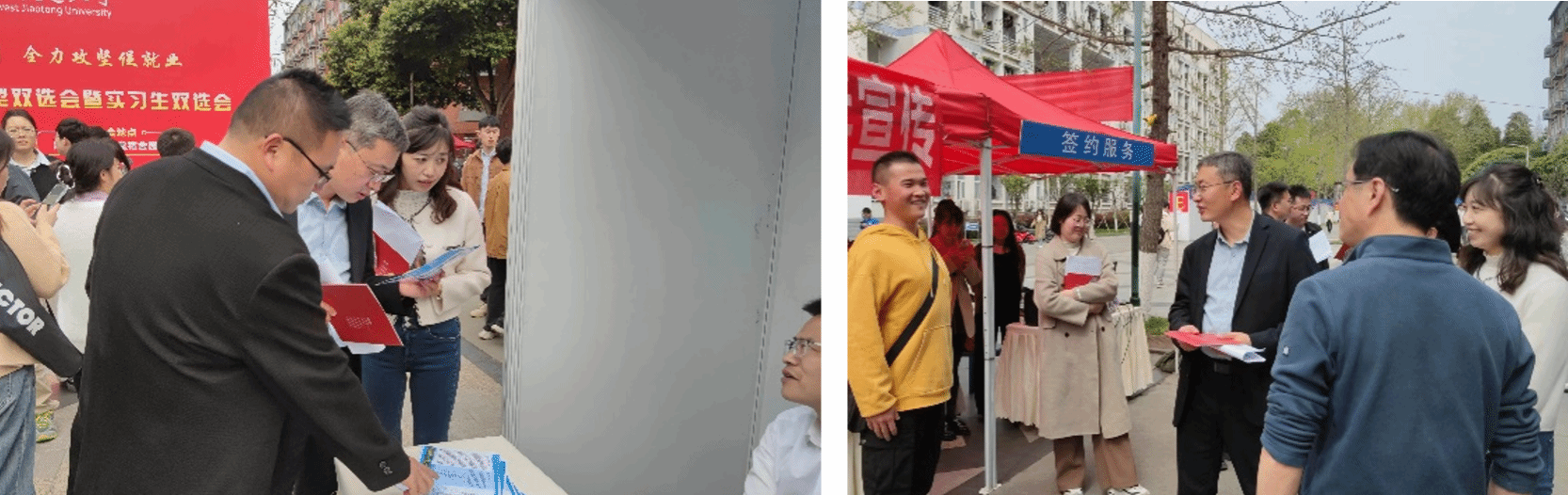 2024年3月26日下午,为抢抓春季促就业关键期,全力促进高校毕业生高质量就业,av大平台 “送岗进寝系列活动” 2024年春季大型双选会暨实习生双选会在犀浦校区学生园区举行。学院党委书记王斌、党委副书记谢力、学院办公室主任樊兵兵、团委书记张异及毕业班辅导员共同来到双选会现场,深入了解学院毕业生的就业情况,并与用人单位沟通交流。