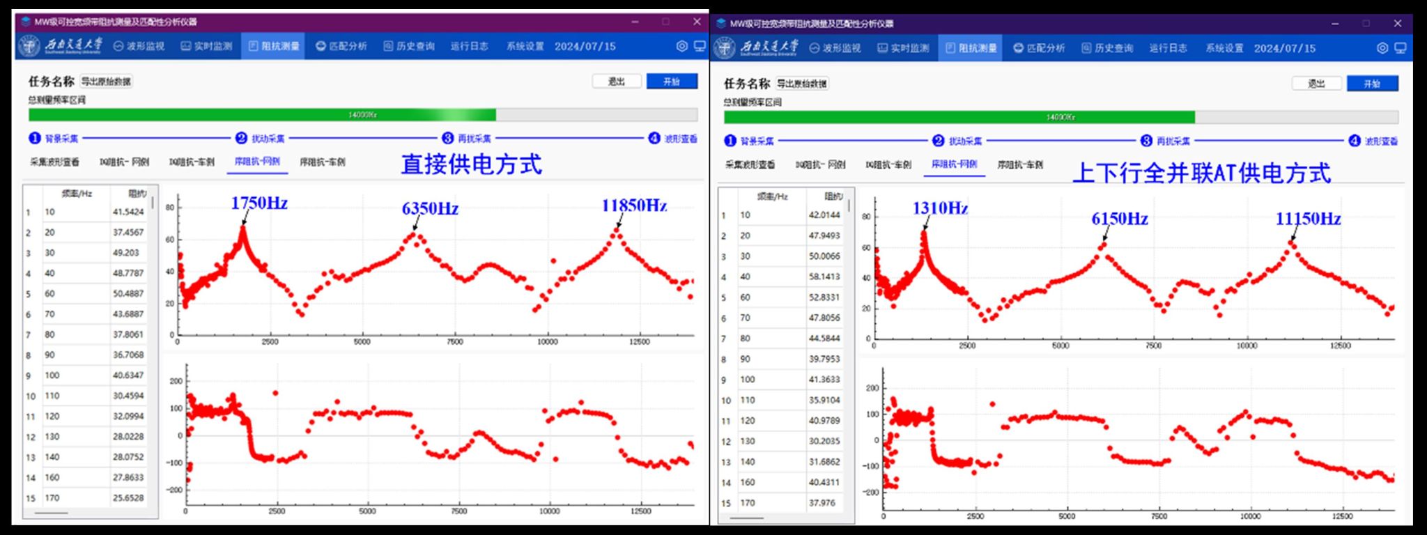 该仪器主要由高压开关柜、宽频变压器、电力电子斩波柜和电阻柜构成。其中,斩波柜通过Chirp-PWM信号控制反串联IGBT模块,投切电阻柜的模块化大功率电阻,产生频带双边可控、能量分布均匀的宽频谐波电流扰动,并通过特制宽频变压器并联注入牵引供电系统,从而获取电压响应并快速测量目标频带的宽频带阻抗特性。仪器的测量频带范围为1Hz~20kHz,一次性等幅注入的谐波个数最高可达1000个,频率分辨率最小可至1Hz。本次现场实验完成了直接供电、AT供电等多种供电方式下的牵引网阻抗测试,仅1分钟就自动完成了1Hz~20kHz的牵引网阻抗快速测量,实时获取了系统宽频带阻抗曲线与谐振幅频信息。仪器一方面可用于车网参数匹配分析,如谐振、宽频带振荡的分析与治理,另一方面可用于故障定位、保护整定校准等。该仪器的成功研制与现场测试推动了我国铁路牵引供电系统、电力系统在可控多谐波注入式阻抗测量技术方面的发展和进步,具有重要的技术引领与示范作用。