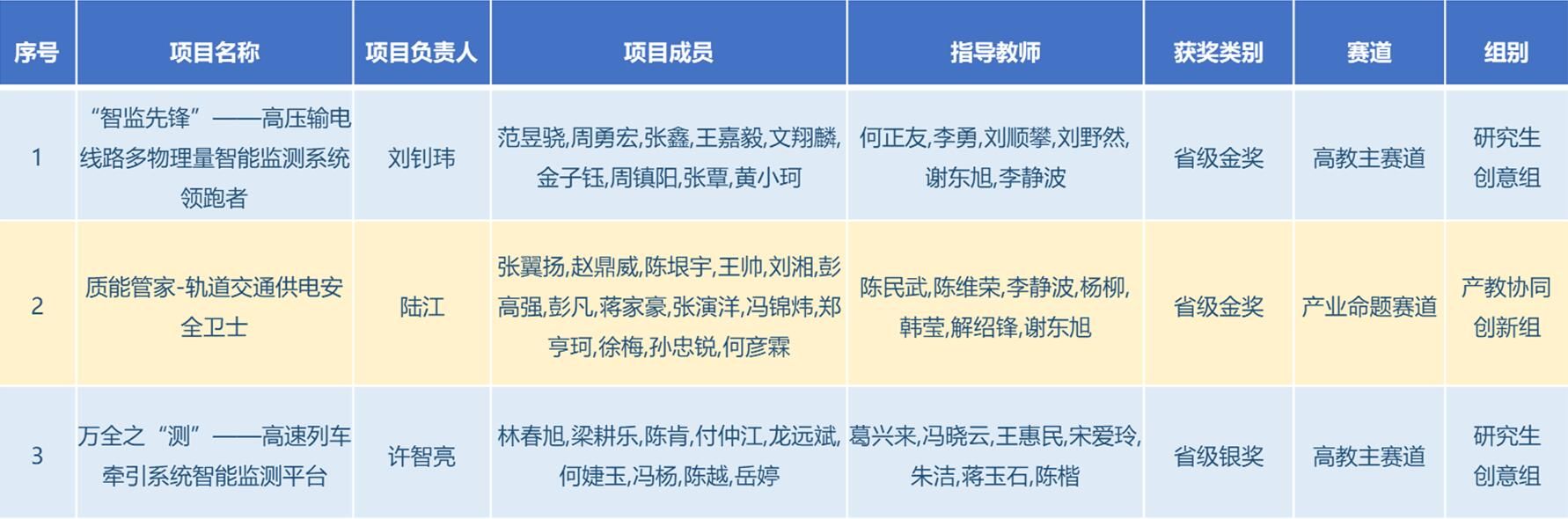 电气学院何正友教授指导的《“智监先锋”——高压输电线路多物理量智能监测系统领跑者》以及陈民武教授指导的《质能管家-轨道交通供电安全卫士》分别斩获主赛道及产业赛道的金奖,葛兴来教授指导的《万全之“测”——高速列车牵引系统智能监测平台》斩获主赛道银奖。