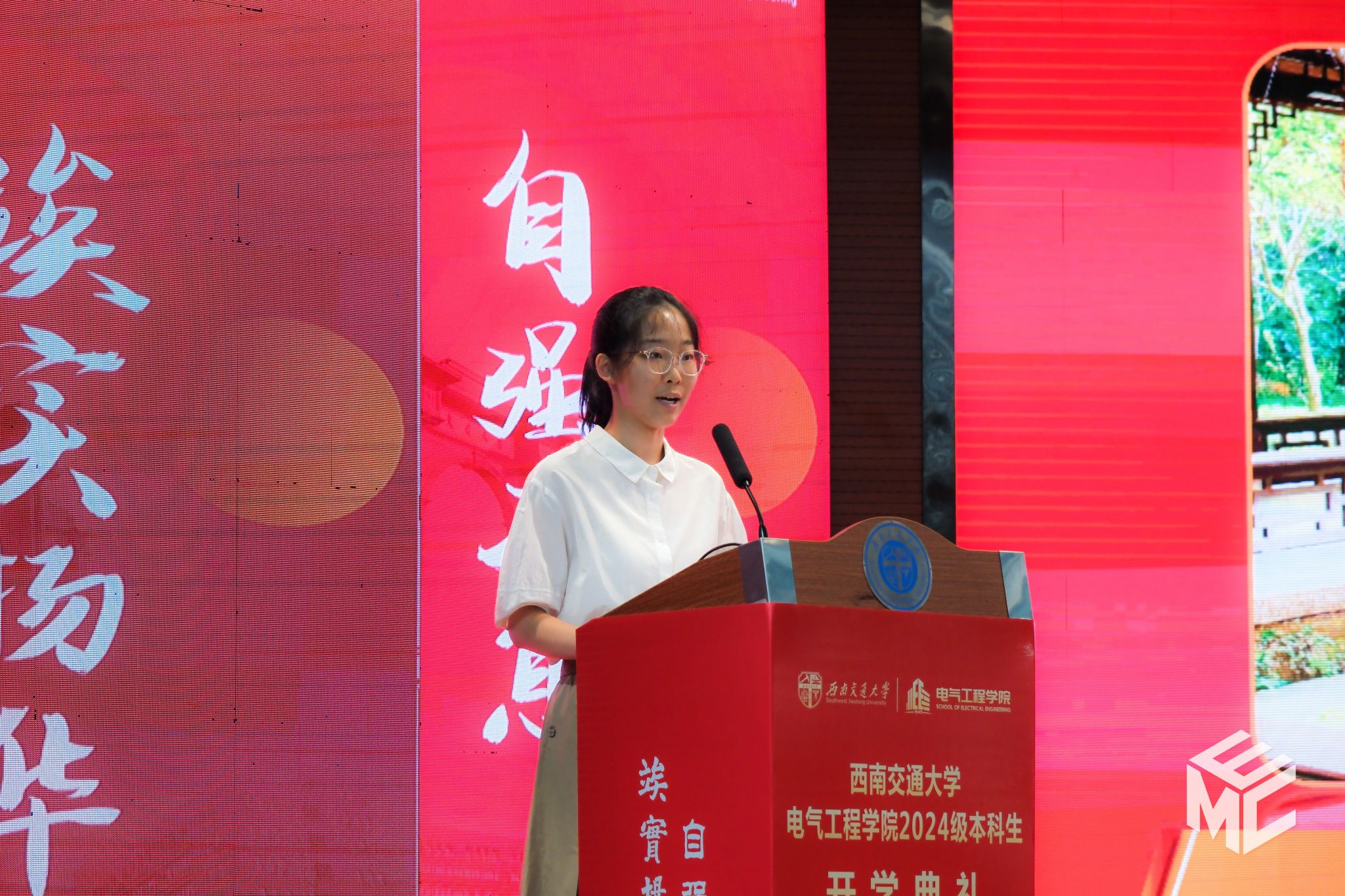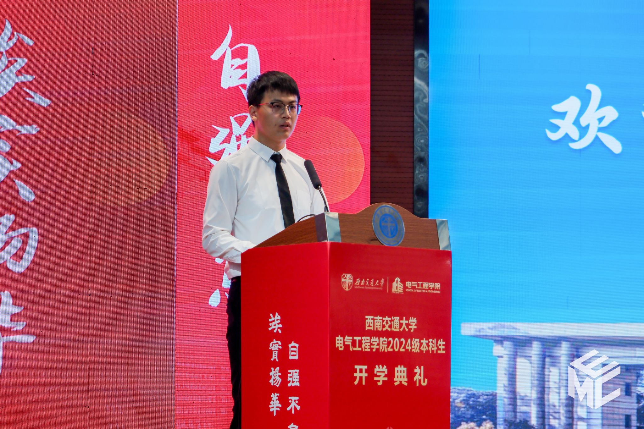 高年级学生代表、本科2021级冯洪赟同学以“寻找热爱,实现全面发展”为主题,向全体新同学讲述了自己的奋斗历程。冯洪赟向同学们分享了三点感悟,一是勤学苦行,夯实成长之基。大一恰是探索自我的绝佳时机,同学们需从被动接受转变为主动探究。二是投身实践,开拓无限可能。作为工科生,同学们应当深化理论学习,珍惜实践机会,提升专业素养。三是遵循热爱,成就全面发展。学院为同学们组织了丰富多彩的课外活动,社团和学生组织是提升综合素质的宝贵平台。最后,冯洪赟勉励全体新同学:生逢盛世、应不负盛世,生逢其时、当奋斗其时。同学们应发扬“厚德载物,求是创新”的电气精神,努力成为担当民族复兴重任的时代新人!