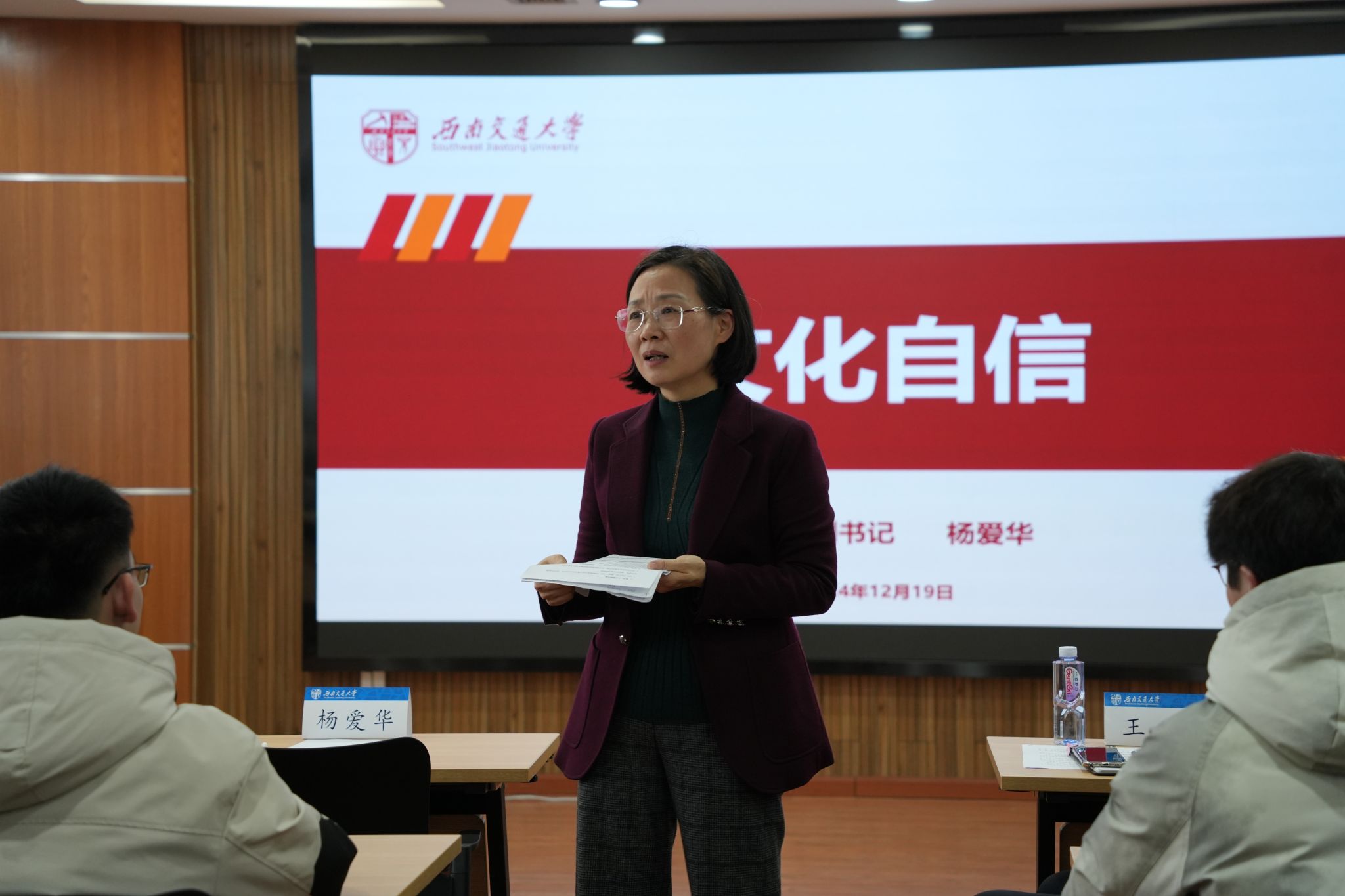 为增强历史自觉,坚定文化自信,弘扬家国情怀,不断增强青年学子的归属感、认同感、尊严感、荣誉感,12月19日下午,学院党委邀请校党委杨爱华副书记讲授《文化自信》专题思政课。学院党委书记王斌、党委副书记邢晓鹏、团委书记张异及本科2021级学生党员共上思政课。