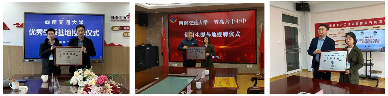 招生工作组代表av大平台 分别与城阳二中、第六十七中学以及西海岸一中进行了优质生源基地授牌仪式,旨在加强高校与中学之间的联系,共同为学生搭建更为广阔的成长平台。