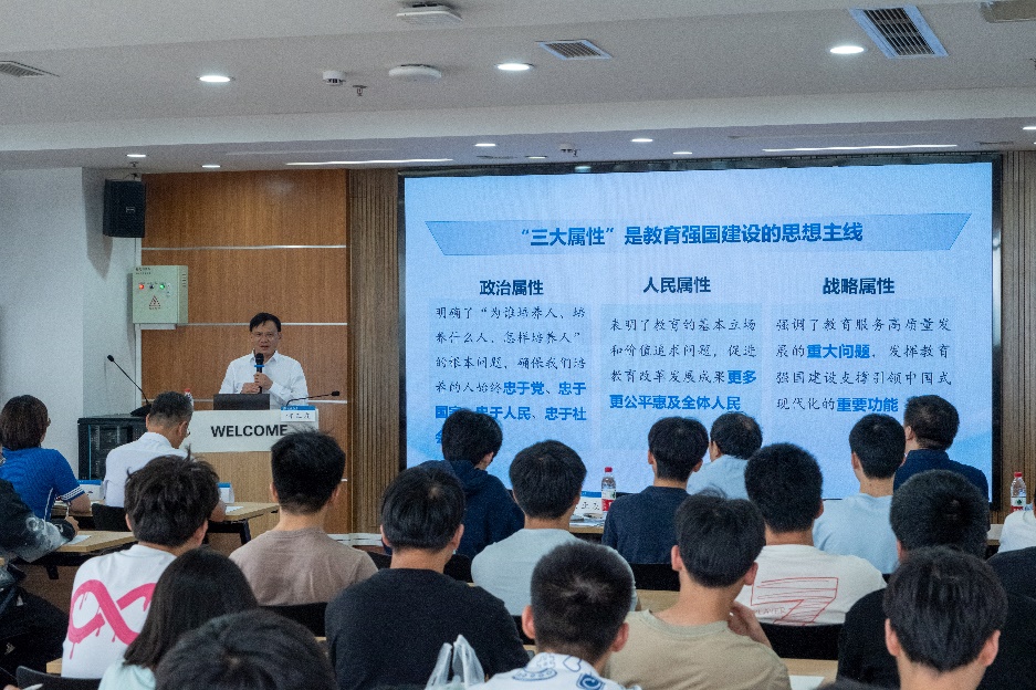 为引导师生深刻认识教育强国建设的战略意义,5月14日下午,av大平台 党委常委、副校长何正友为学院师生讲授《从教育大国迈向教育强国》专题思政课。学院党委书记王斌、党委副书记邢晓鹏、团委书记张异、学工组辅导员及本科各年级学生共同学习。