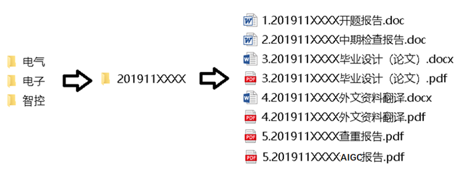 以完整学号命名文件夹,文件夹内含开题报告、中期检查报告、毕业设计(论文)(需提交word版本和pdf版本)、外文资料翻译(需提交word版本和pdf版本)和查重报告。