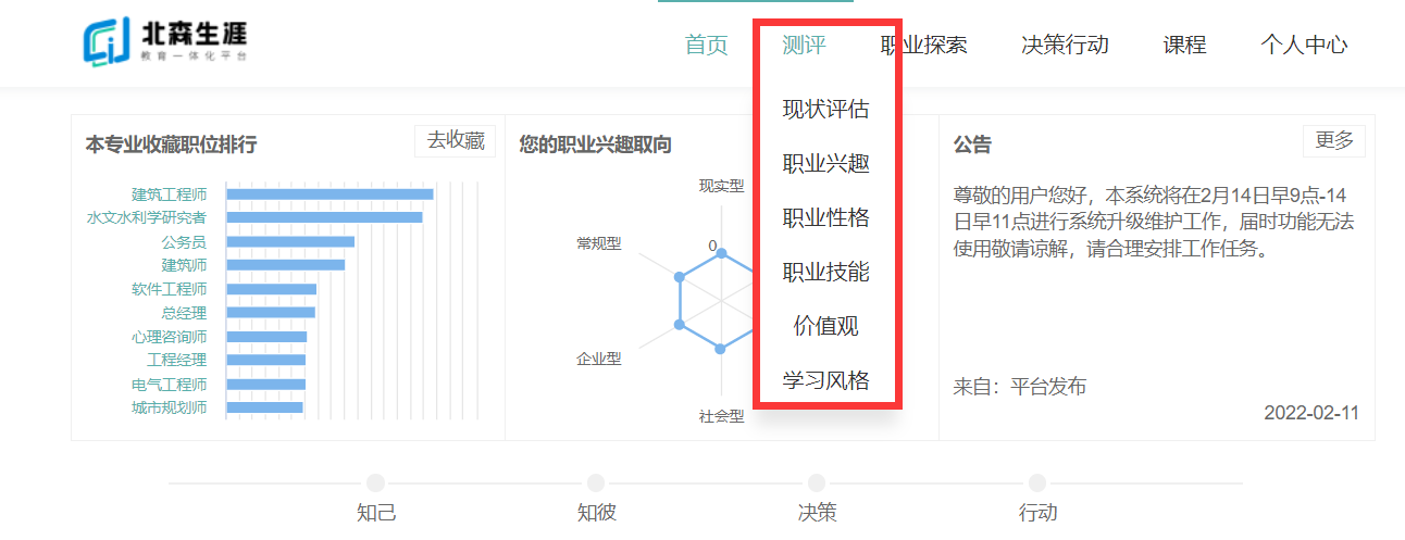 进入“生涯测评”模块,并进行测评和学习。测评完成将会获得相应的评估报告,根据报告同学们可以更加清楚的了解自我、职业以及决策行动。